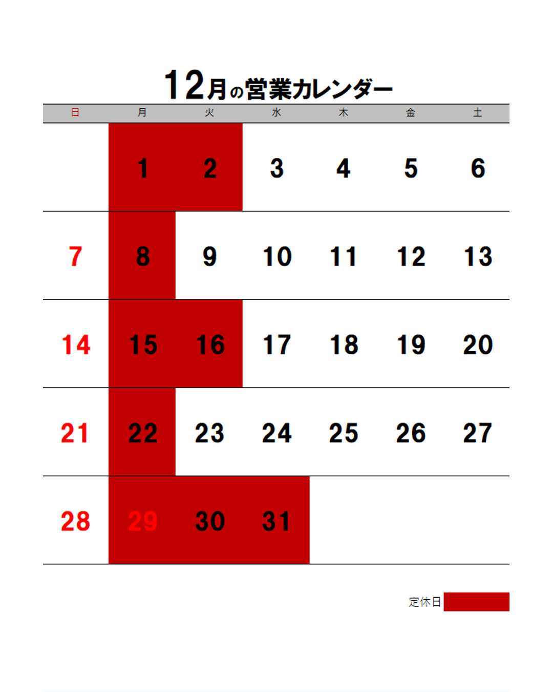 日頃は、フィアット/アバルト浜松をご愛顧いただき誠にありがとうございます。11月・12月の営業日については以下とさせていただきます。